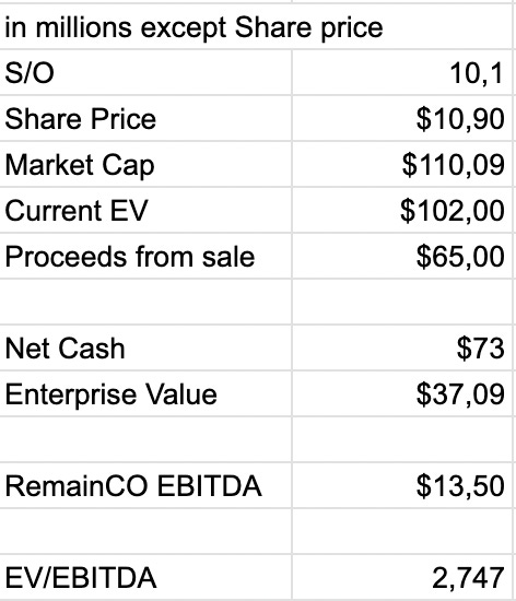 But we are not in 2022 anymore, taking the recent quarter of $1.70 million EBIT and annualizing it, we would get $6.8 million EBIT. Multiply that by 9.5 and you get a valuation of about $65 million.