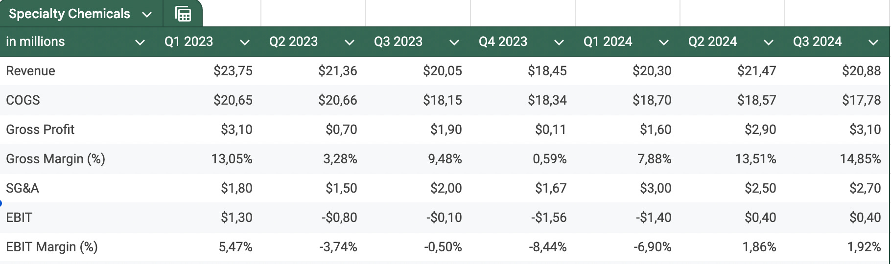 They tend to have recurring revenues and long-term customer relationships, making revenues more predictable and less lumpy. The problem: Due to destocking trends in end markets, the entire specialty chemicals industry has been suffering from lower revenues since 2023. Again, despite industry headwinds, the new management has been able to improve EBIT in this segment from -$1.40 in Q1 of this year to $0.4 in EBIT in Q2 and Q3.