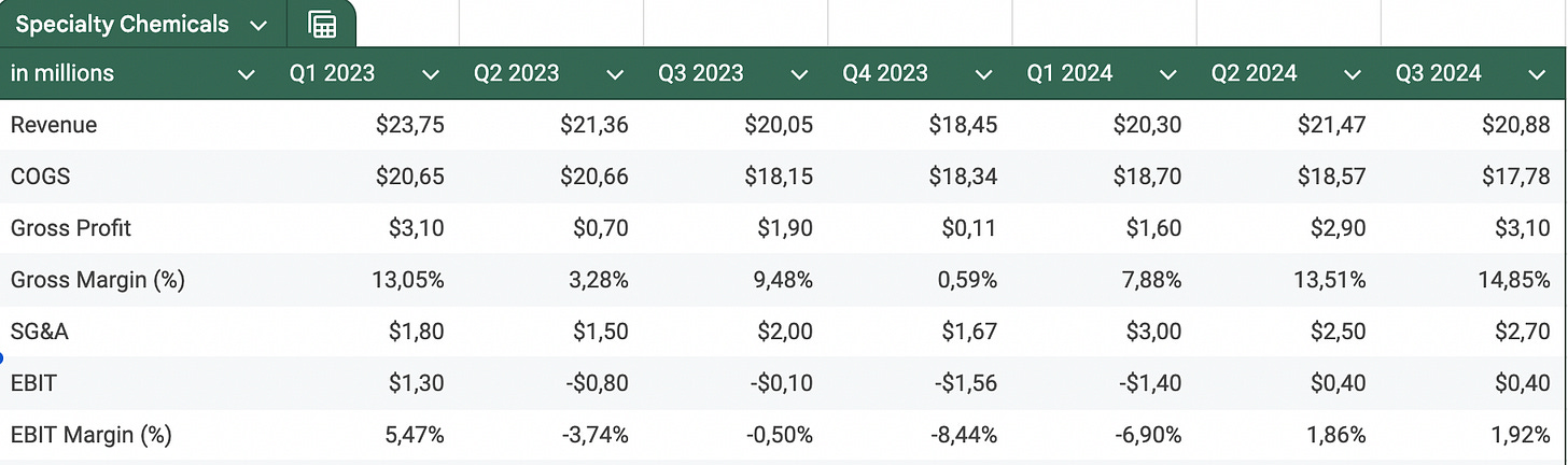 Bryan Kitchen took over as President of the Chemicals segment in September 2023 and as CEO in February 2024. So I would not judge the numbers before the first quarter of 2024. In particular, I think the gross margin improvements are impressive. Despite lower revenue levels than in Q1 2023, gross margins are higher. In fact, they are almost as high as they were in 2020, when the segment had the highest margins in its recent history.
