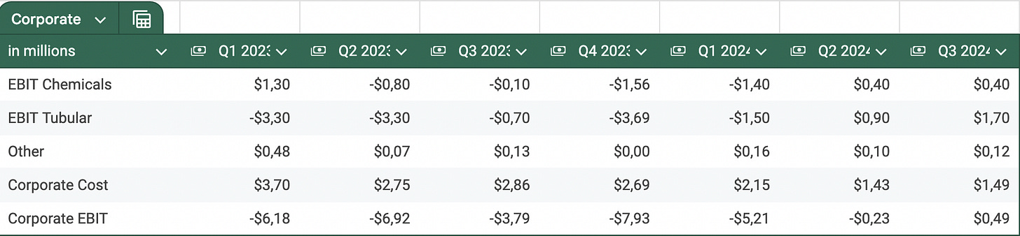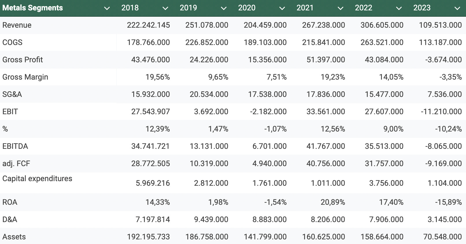 This segment is a pure commodity. With low steel prices, this segment's earnings have been suffering since 2023. Going from $33 million EBIT in 2022 (including a divested subsidiary) to -$11.5 million EBIT in 2023. However, under new management, the segment has been profitable in the last two quarters ($0.9 million in Q2, $1.7 million in Q3).