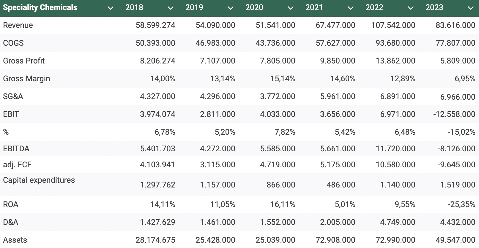 Until 2023 the segment has been profitable. The jump from 2021 to 2022 was due to the acquisition of DanChem. Historical EBIT margin has been around 6-8% (8-11% for EBITDA).