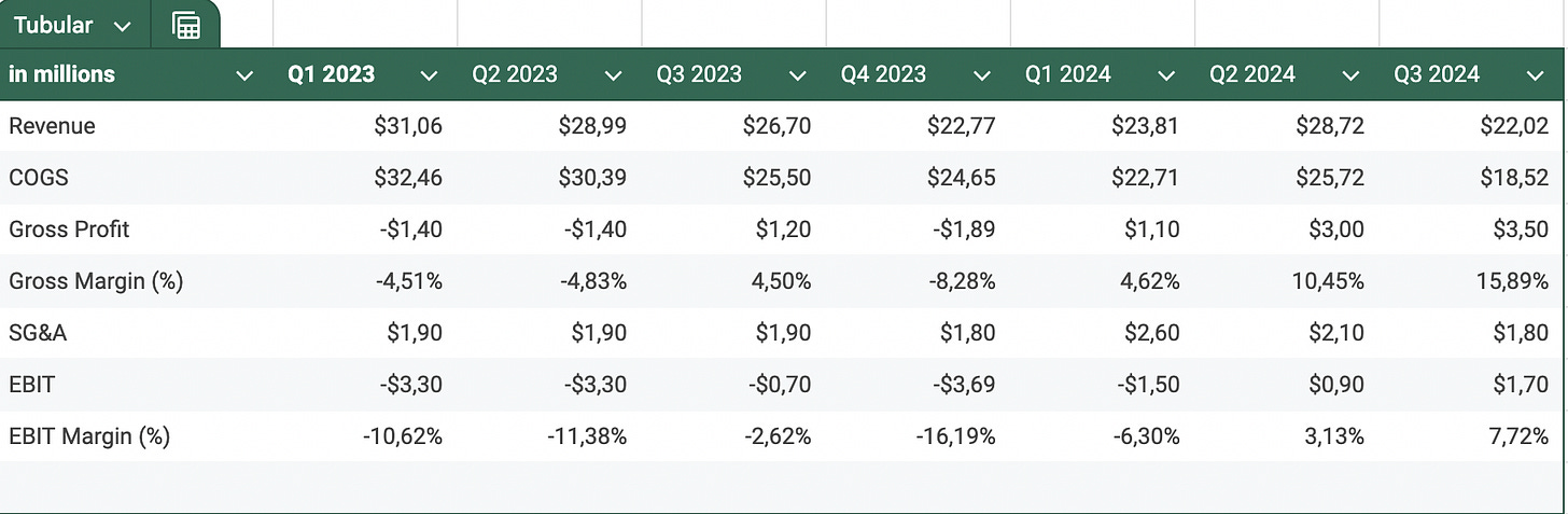 Despite industry-wide headwinds in both segments, the new management team has increased gross margins from 5% in Q1 2024 to 15% in Q3 2024.