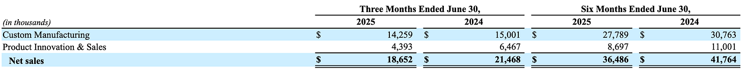 They also began breaking down their sales by custom manufacturing and products. Both categories saw a year-over-year decline in sales.
