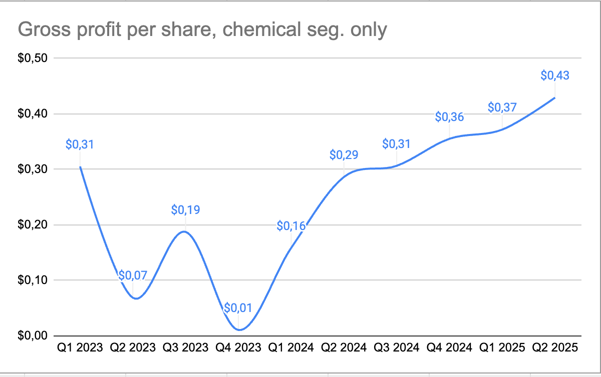 For an apples-to-apples comparison, I only considered the gross profits of their chemical segment, and I also took into account their reclassification of expenses in Q2.1 This metric received a boost in Q2 from their repurchase of 644,171 shares, or 6.4% of the shares outstanding.
