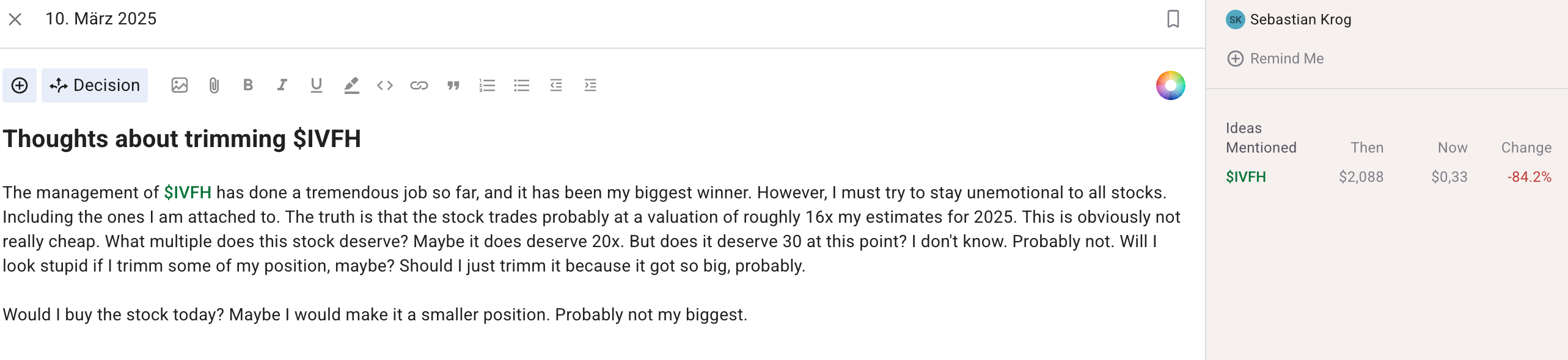 This IVFH post-mortem is of a different nature. The error was not as much analytical but purely psychological. I guess it was a lesson I needed to learn, not just in investing but in life in general. I am glad I did, in a weird way, and I really hope that this is now burned into my memory. I am hopeful it is, and if so, it would make me a better investor.