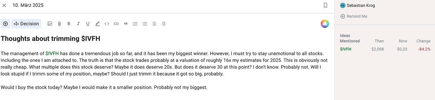 In February, I knew the stock was overvalued. I even had a small sell order in place, which I didn’t follow through on. Here is what I wrote in my journal on March 10th, 2025: