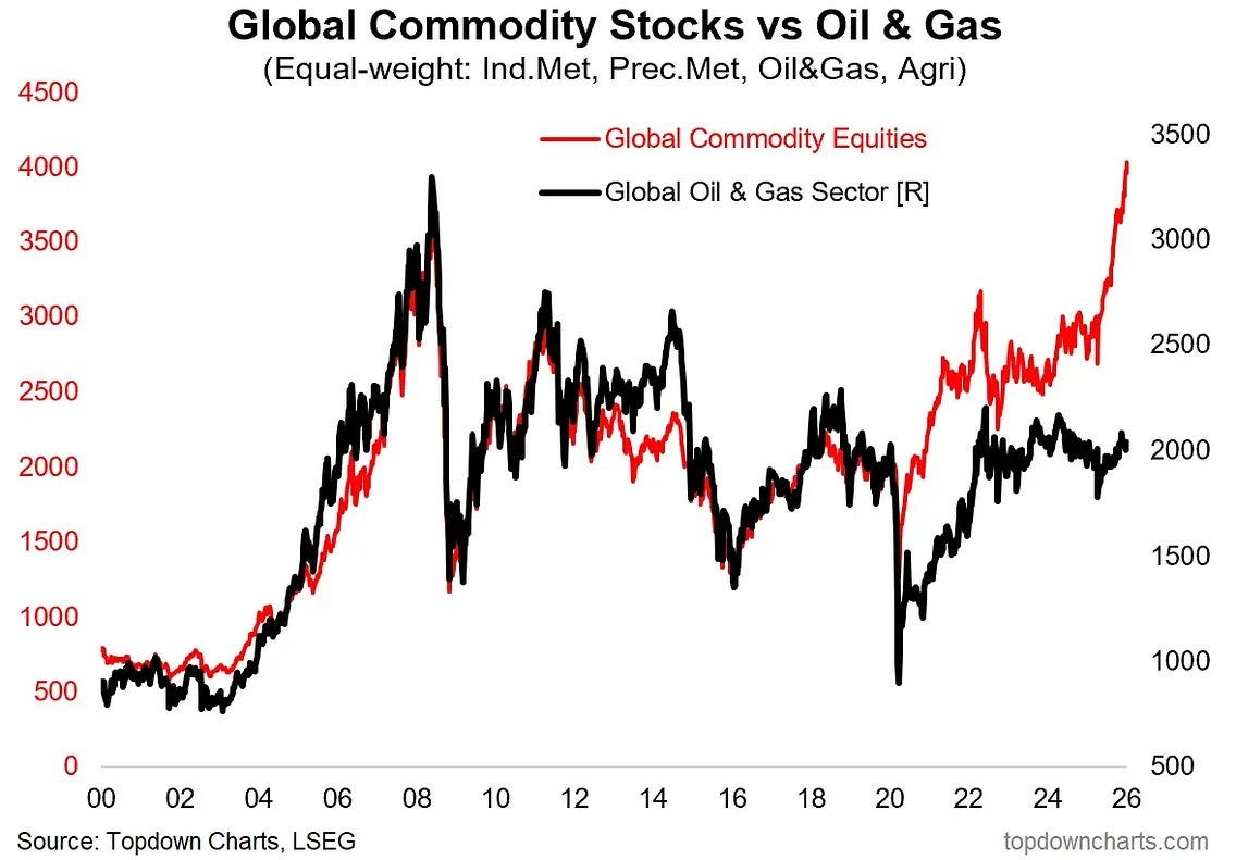 #3: Lagging behind other commodities. While basically all commodities have been going straight up since 2025, oil has actually declined. As this chart indicates, this is somewhat of a divergence from past behavior.