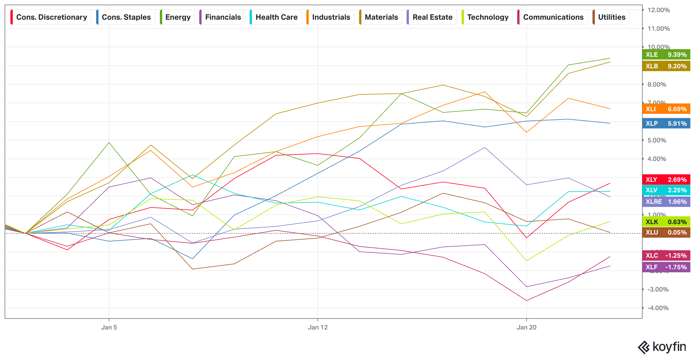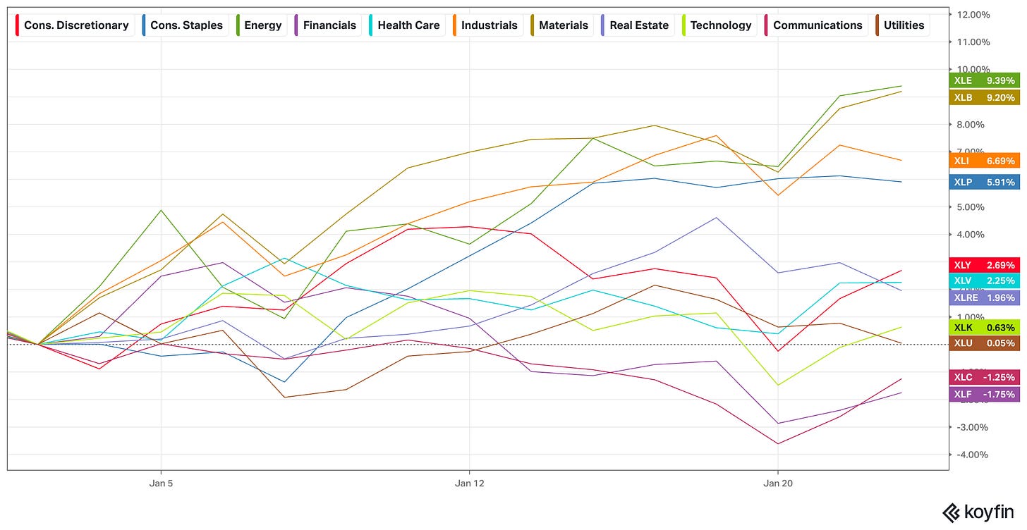 #2: Oil stocks had a strong start to the year and have been outperforming oil prices. However, I would take the XLE with a grain of salt because Chevron and Exxon combined are 40% of the index. Nonetheless, it’s noteworthy.