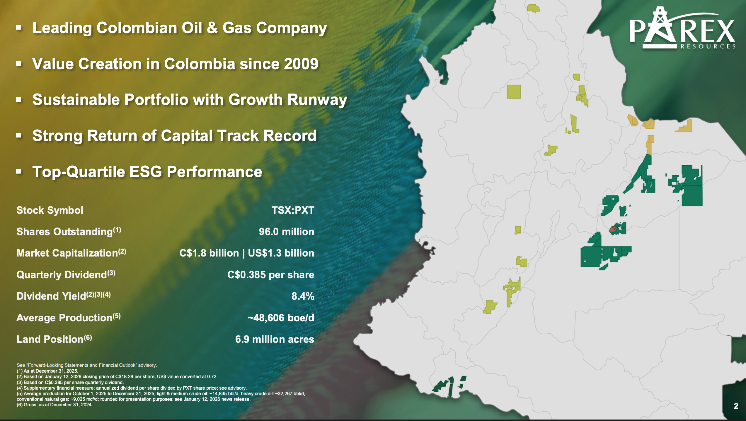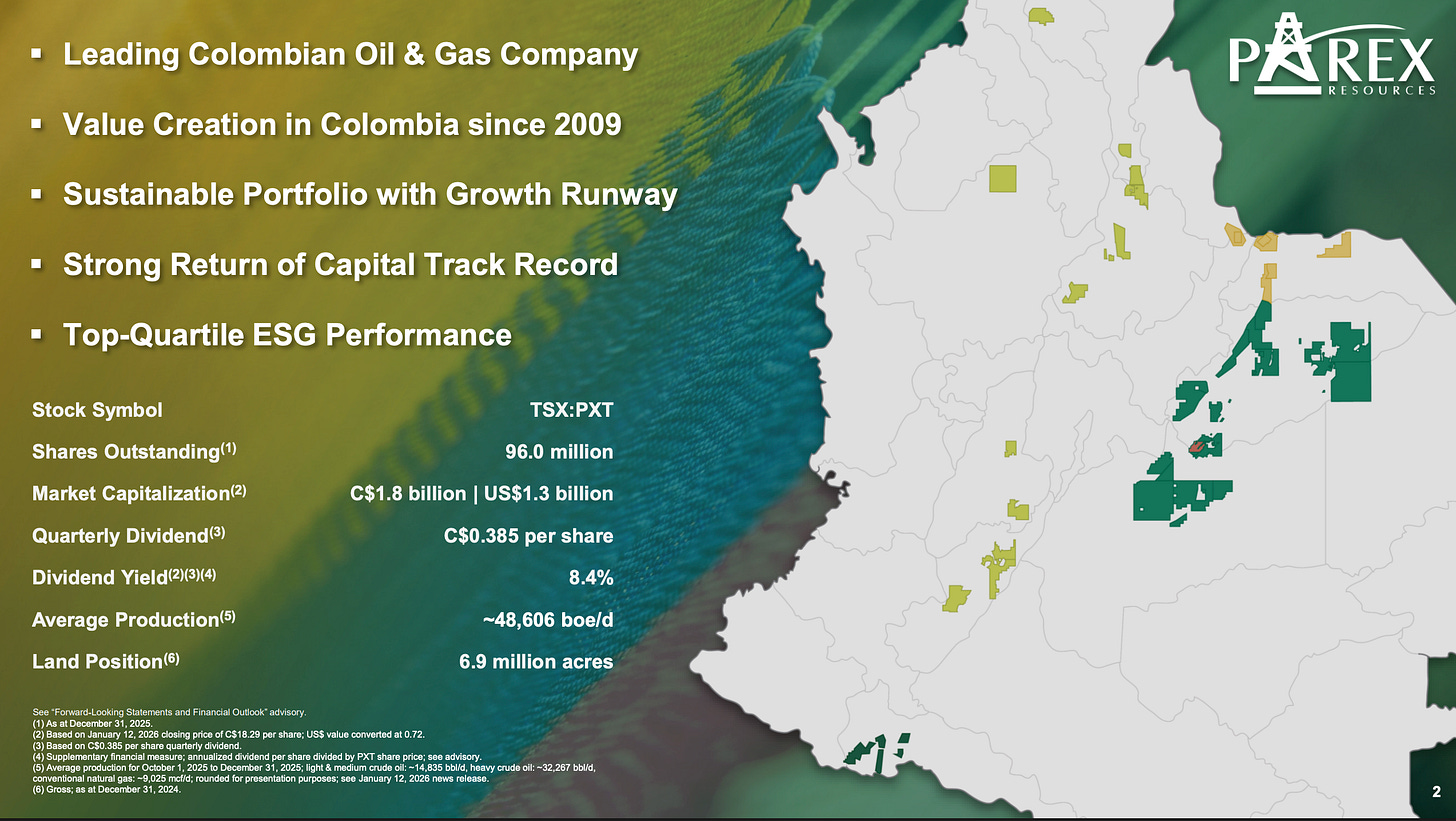 If you want to look one row behind Ecopetrol, Parex Resources (PXT.TO) is the largest 100% privately owned oil producer with 100% Colombian exposure. The market cap is roughly US$1 billion, and they trade at the typical Colombian discount of 2.5x EV/EBITDA for a debt-free oil producer that has returned money to shareholders through buybacks and dividends (current yield is 8%).
