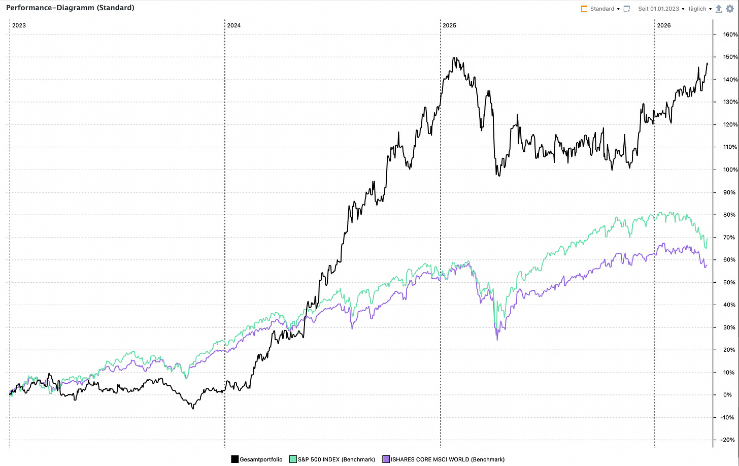 This brings my overall return, since Jan 1 2023, to 147%, which equals a CAGR of 32.1%. Compared to the S&P 500 of 70% (17.7% CAGR), and MSCI World of 57.80% (15.1% CAGR).