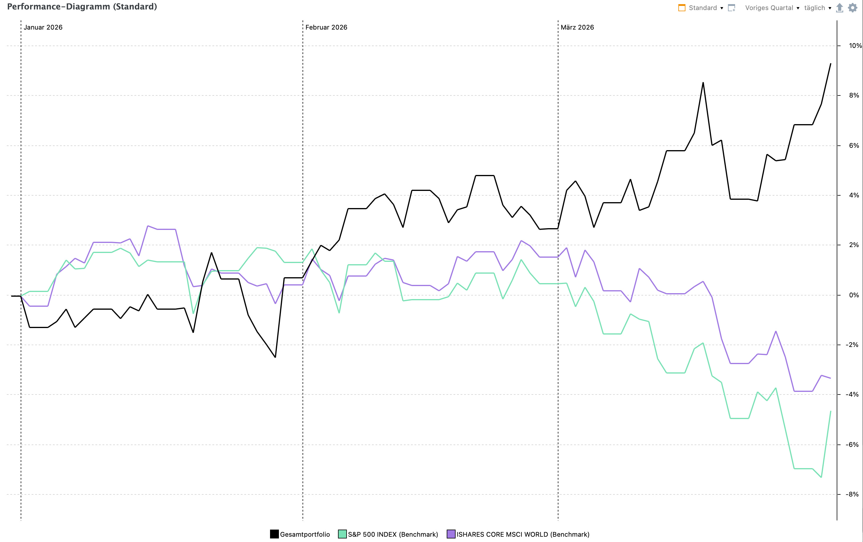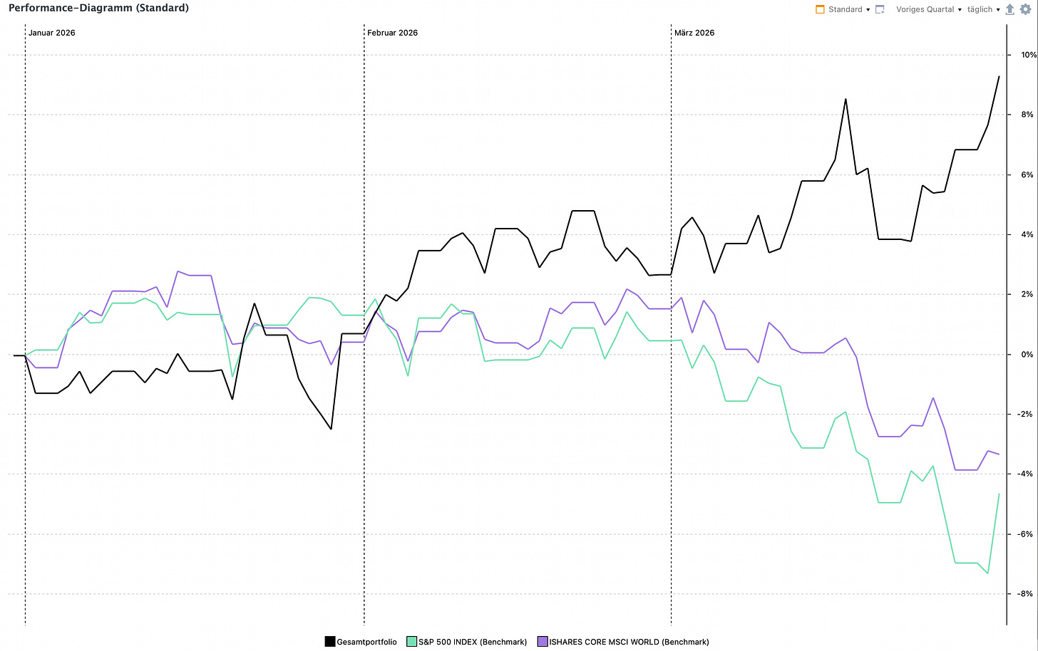 I am very pleased with my performance of the first quarter in 2026 which ended at 9.1%, and therefore compared favorably to the S&P 500, that returned -4.63%, as well as the MSCI World which returned -3.1%.