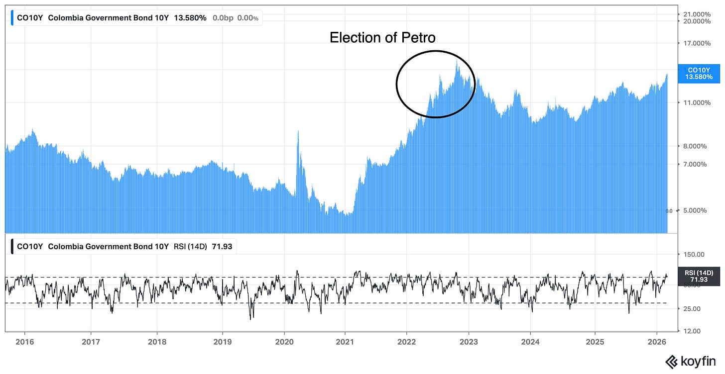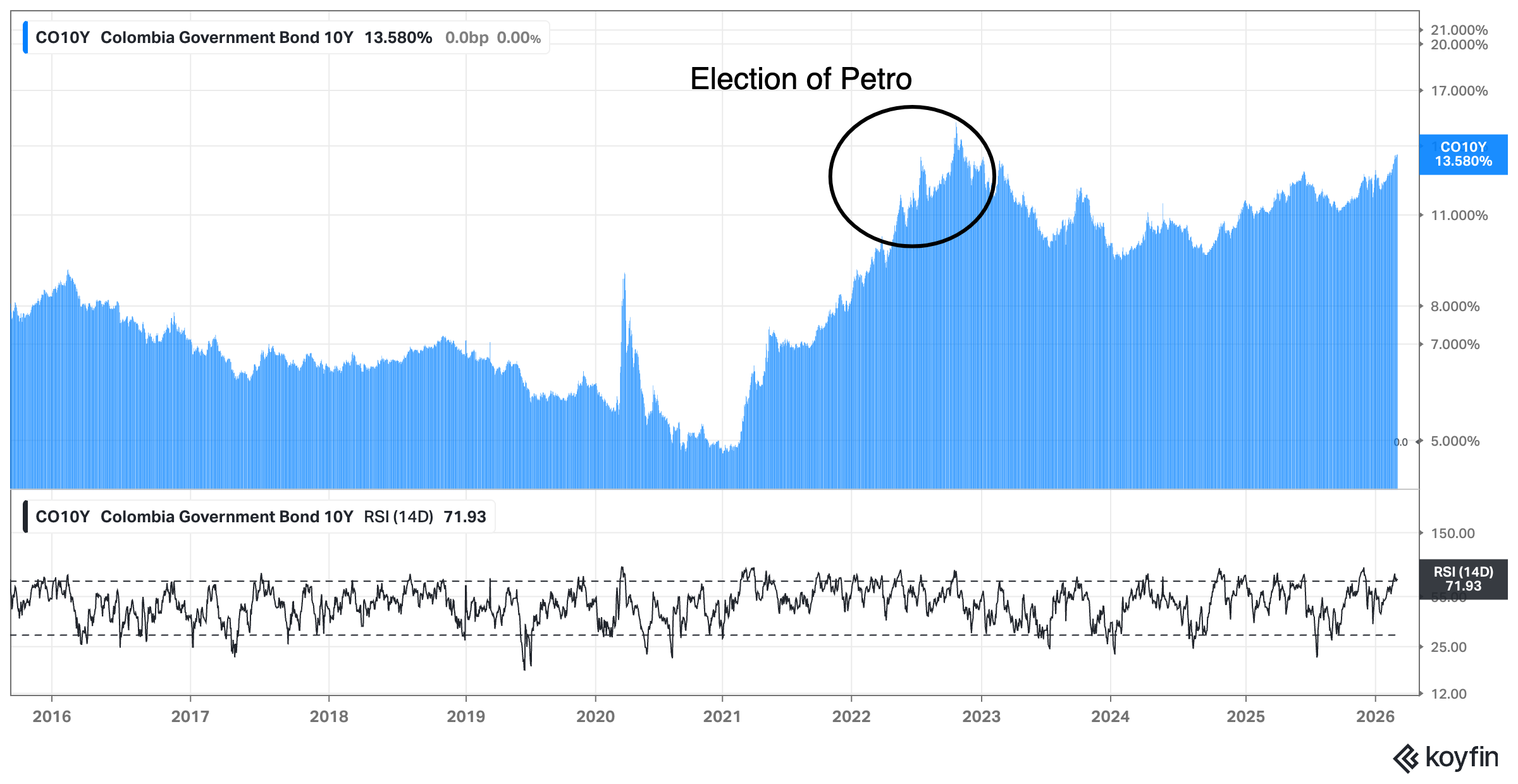 However, this changed when Gustavo Petro won the elections in 2022. The reaction from the market? The Peso crashed to COP5000/USD, and the 10-year yield climbed to a record high of 14%.