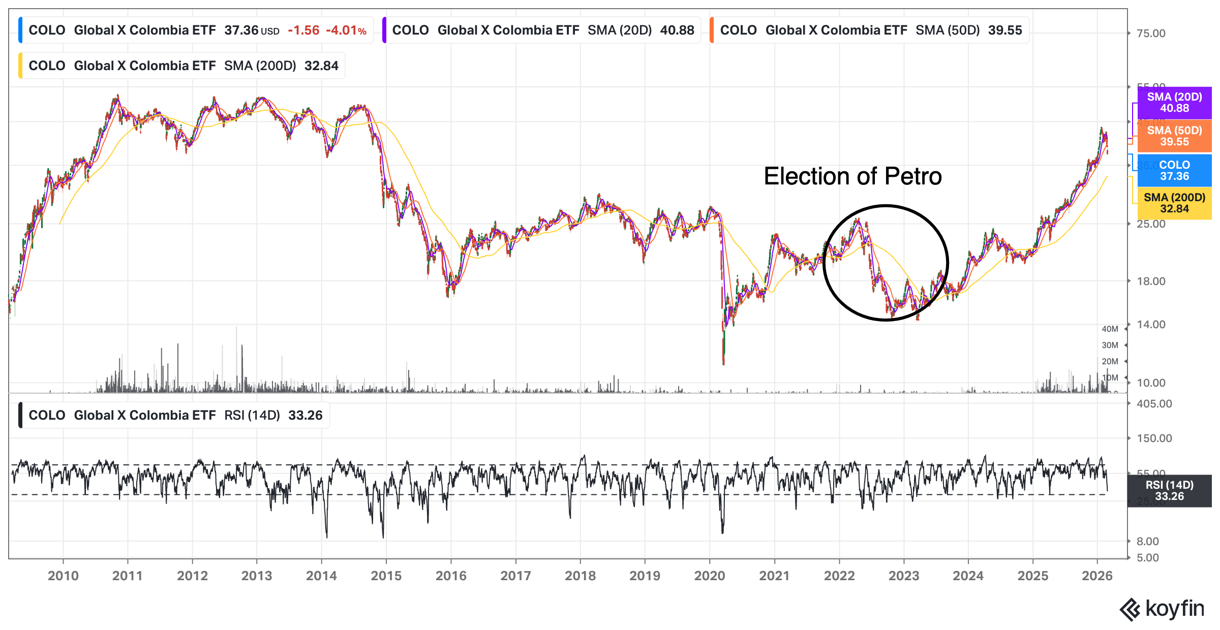 In Congress, neither side won a majority. Petro’s Pacto Histórico gained 5 Senate seats, but Centro Democrático gained 4. The parliament remains fragmented, which, as we’ve seen over the past four years, actually works in investors’ favor: it means no president can do too much damage in either direction.