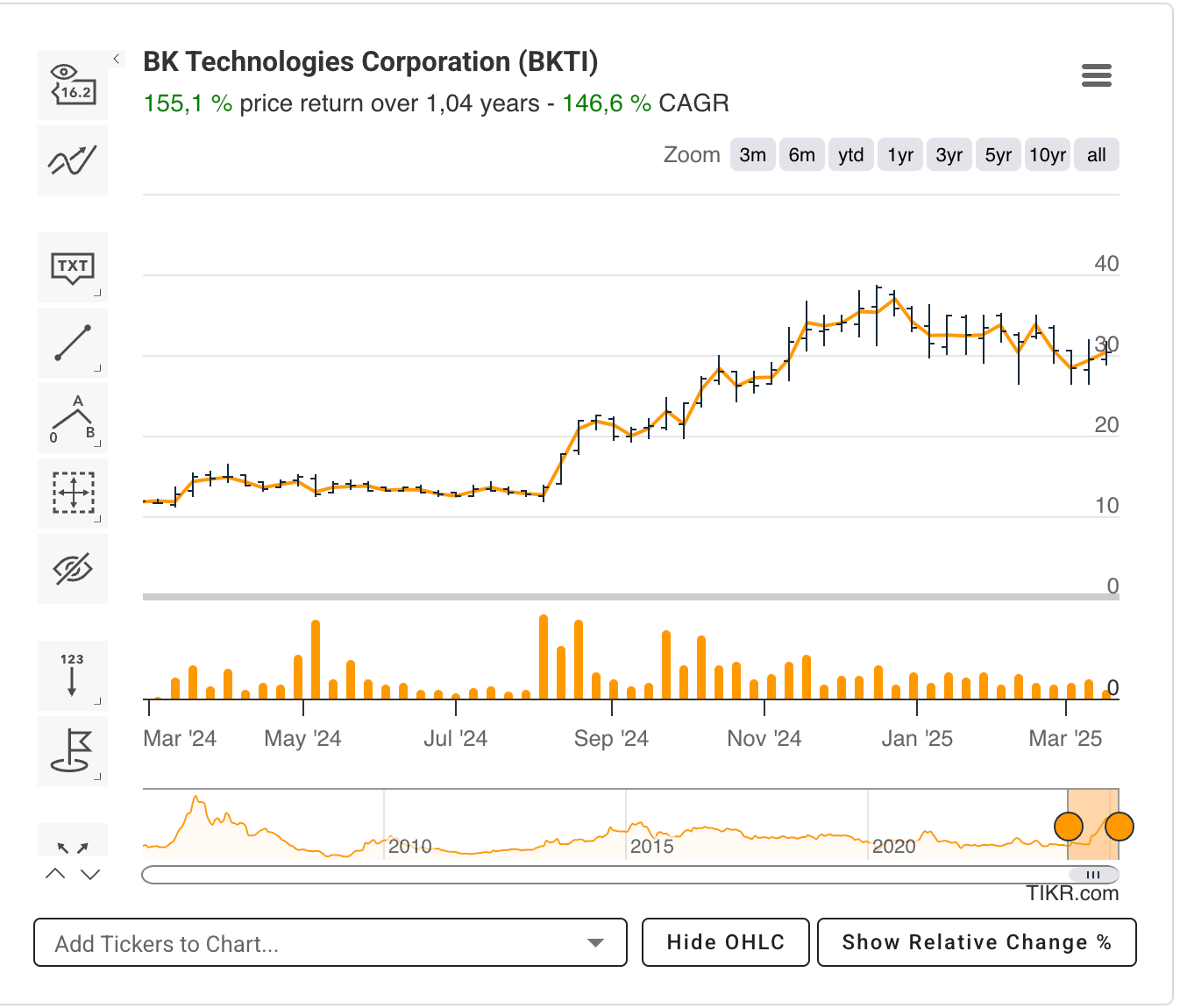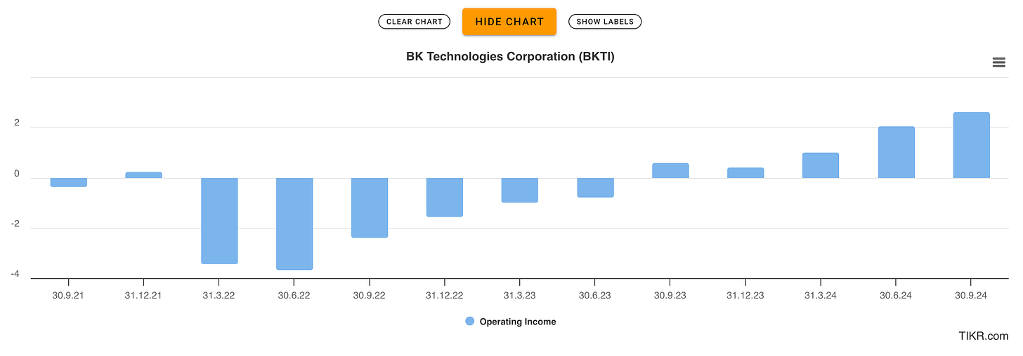 In May 2024, I wrote about BK Technologies, BKTI. A $40 million market cap company at the time. The company just became profitable in the last two quarters of 2023. In Q4 of 2024, they did $0.40 million in EBIT. Annualized to $1.60 million and the stock would have traded at 25x EV/EBIT. Not super cheap and first glance, plus I was skeptical that they could continue to grow earnings that much going forward.