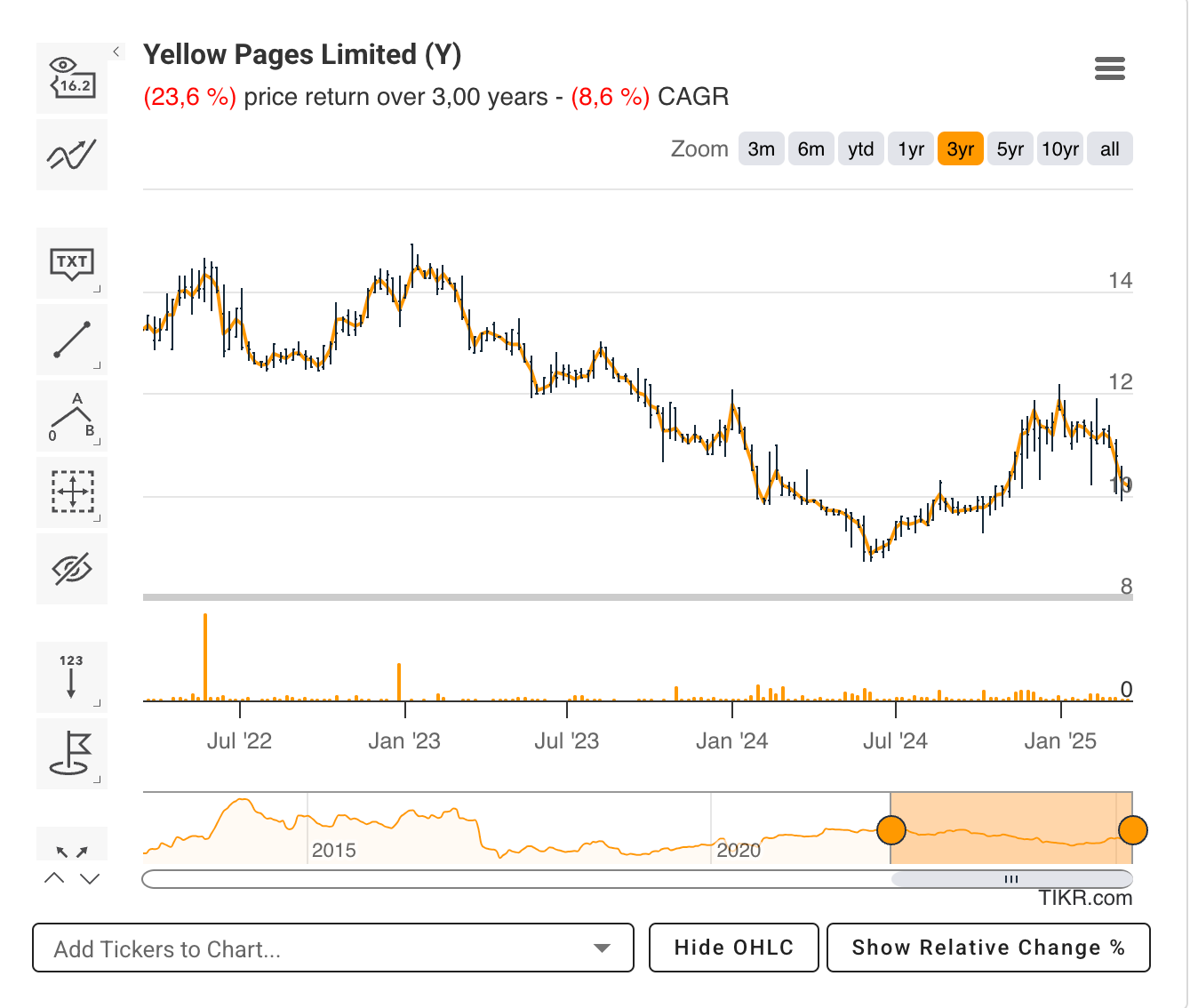 Sales and earnings are declining. The stock used to trade at 3x EBIT. It still trades at 3x EBIT even though it has lost 34% of its market cap. This is not the only example, another stock I looked at briefly is Yellow Pages.
