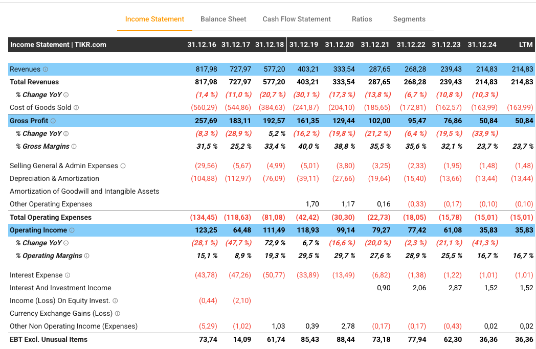 The reason? While the operating income stood at CA$77 million in 2022, it got sliced in half since then, EBIT in 2024: CA$35 million!