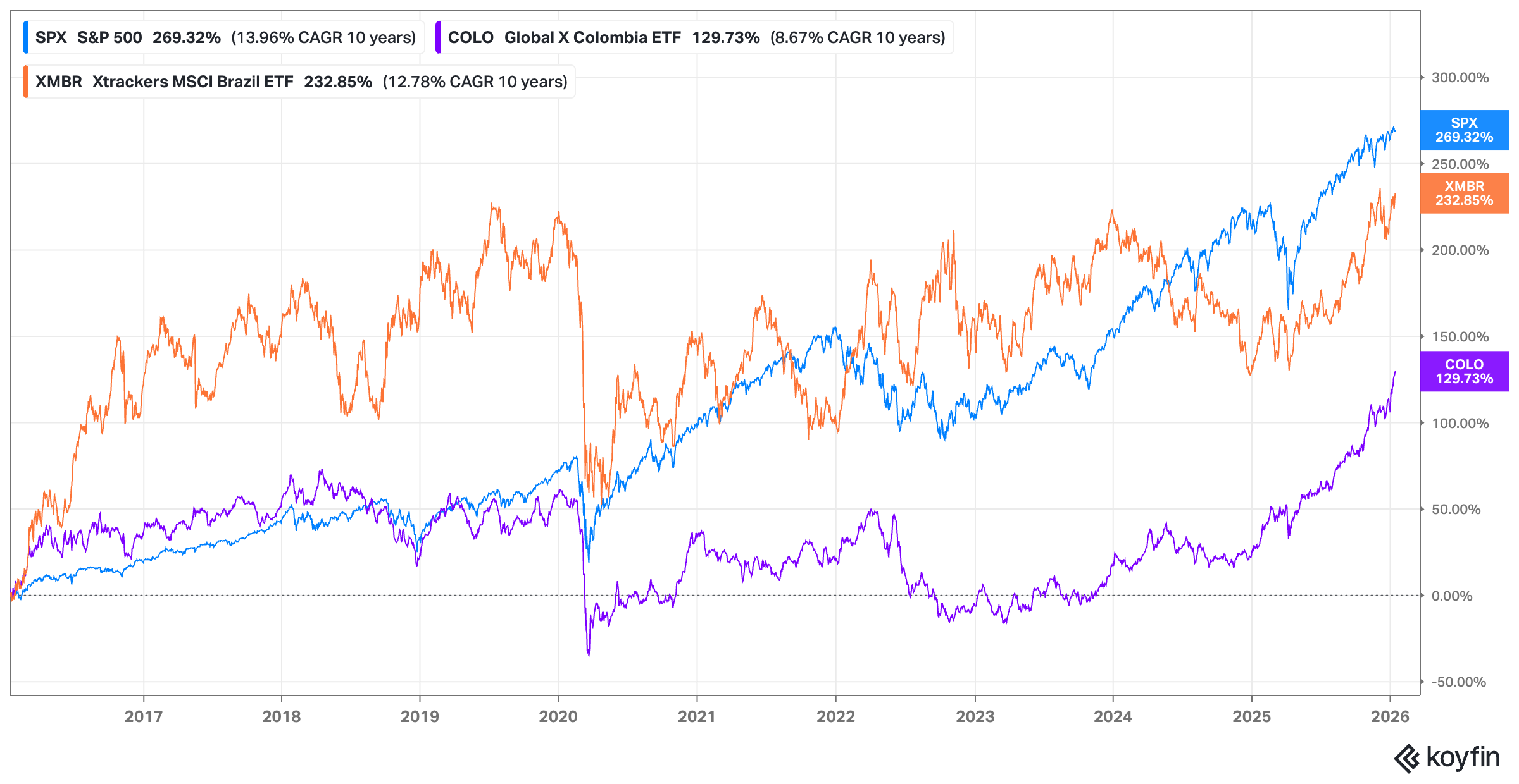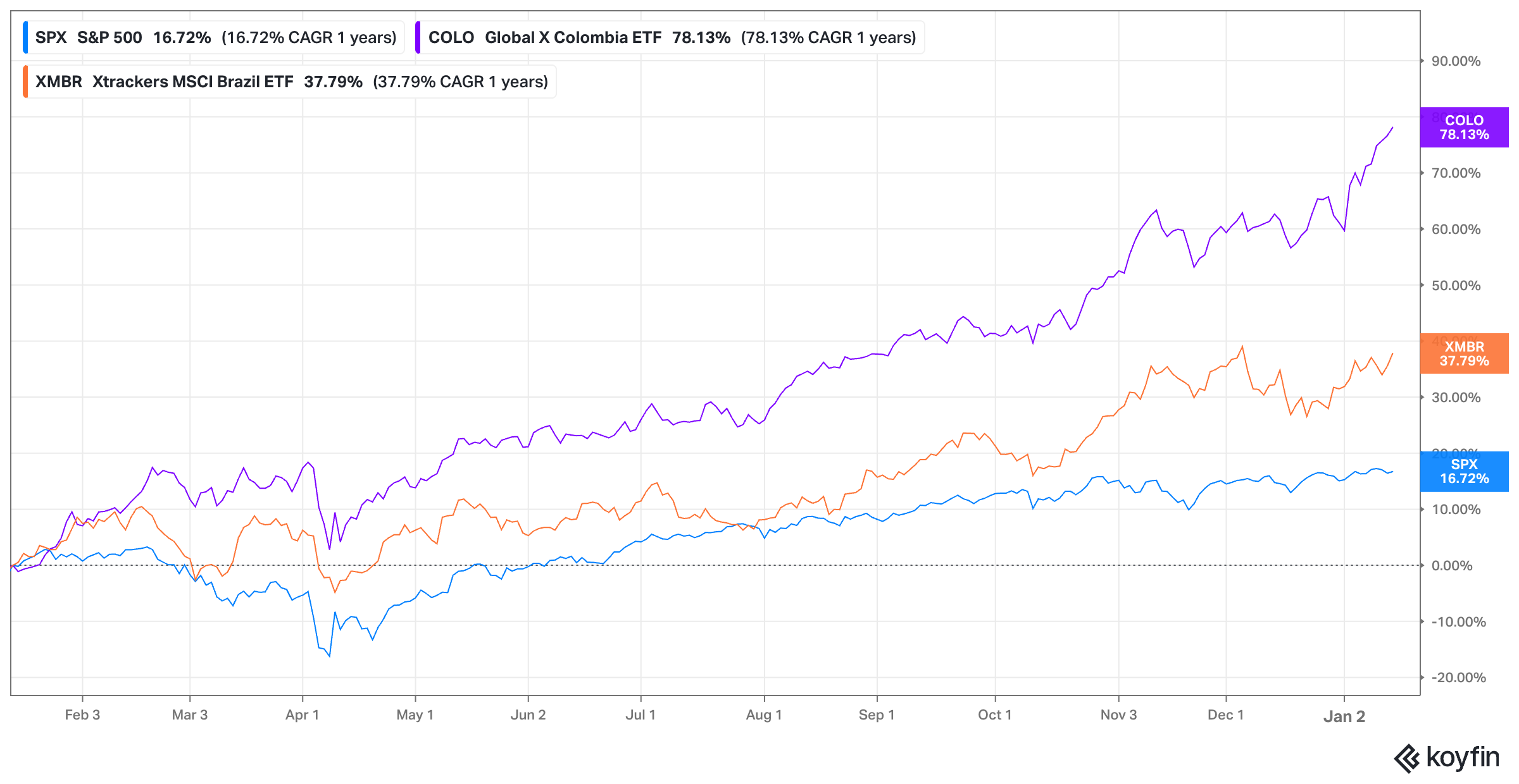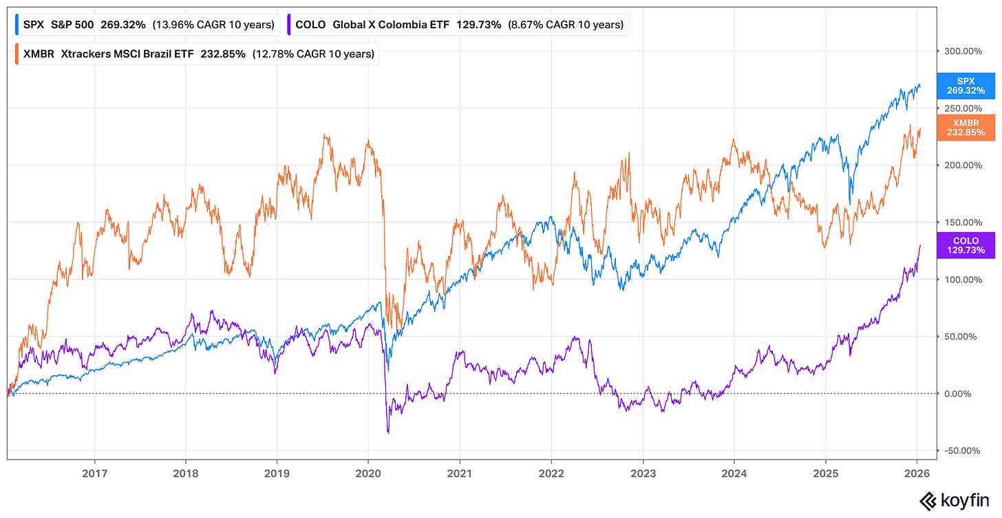The run in commodities is really impressive, and I think it's something that no one would have predicted 4 years ago. The other common theme seems to be that Latin America will continue to perform well. As a resource power hub, that is, country-by-country shifting to the right, it seems very well positioned. And obviously markets have caught up to that. With low starting valuations, it has already made good moves. I would have made way more money if I had just put my portfolio into a Colombian ETF one year ago.