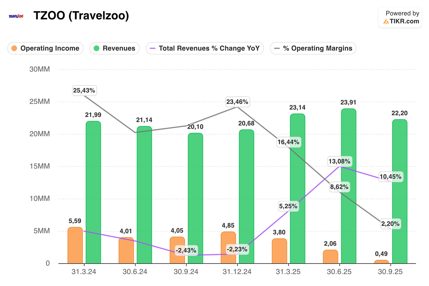 Travelzoo (TZOO) is a global publisher of exclusive travel deals that shifted its business model from getting paid via advertising to a paid membership model at $40/year. However, they now have to spend money upfront to acquire these paid subscribers, and those acquisition costs get expensed immediately while the revenue is recognized over the course of the year—even though they receive the full $40 upfront. So the GAAP numbers look worse because the expense hits today, but the revenue gets spread out over twelve months. The market has been selling off on this constant decrease in operating profits each quarter this year.