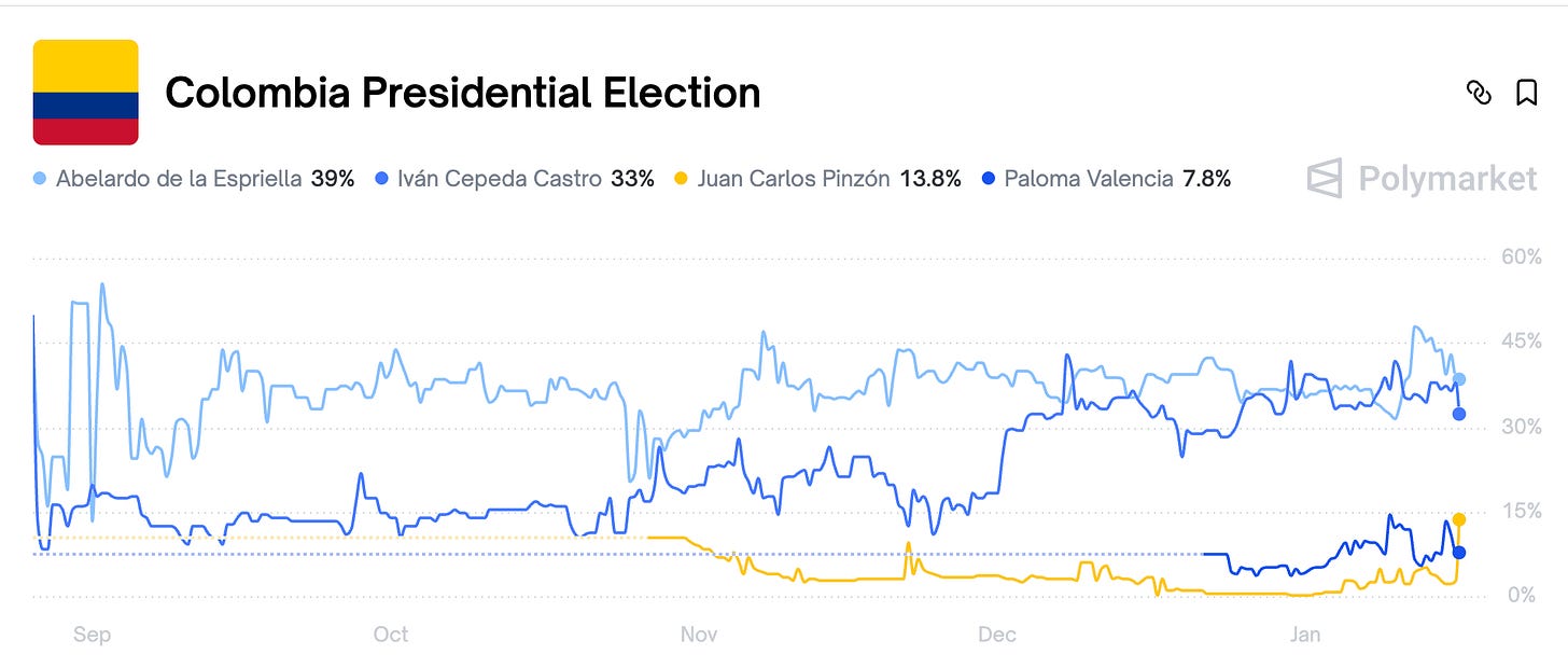 I, and apparently the market as well, think that a right-wing candidate in Colombia is more likely to be elected than in Brazil. Colombia has historically voted right-wing/center-ish. Current president Petro cannot be re-elected. Favorites right now are right-wing newcomer de la Espriella, and left-wing successor of Petro’s politics, Cepeda. There is also still a chance someone else makes the race, like Pinzón or Valencia.